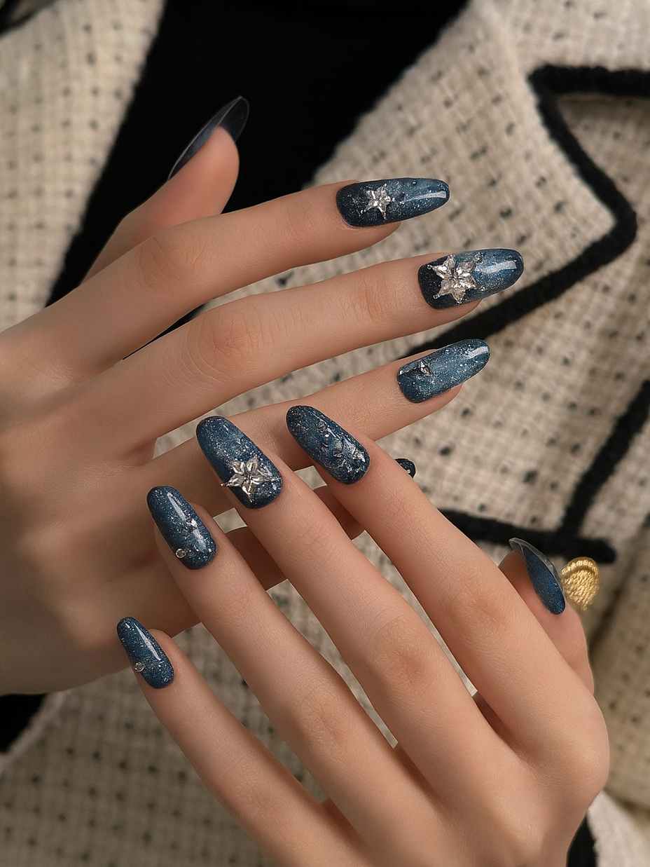 These nails are pure NYC drama in the best way, luxe gemstones and a sleek black tip. Stayed flawless all night.
