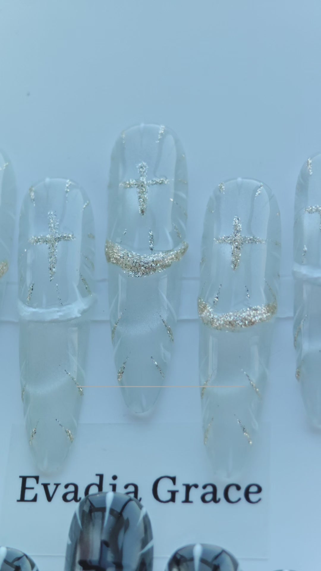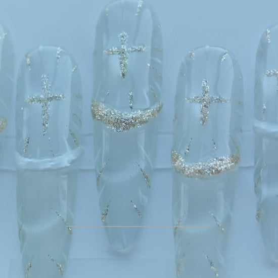 Holy Contrast Cross Nails – Black & Clear Gothic Press-On Nails with Gold Glitter Cross Design | Dark Aesthetic Nails by Evadia Grace