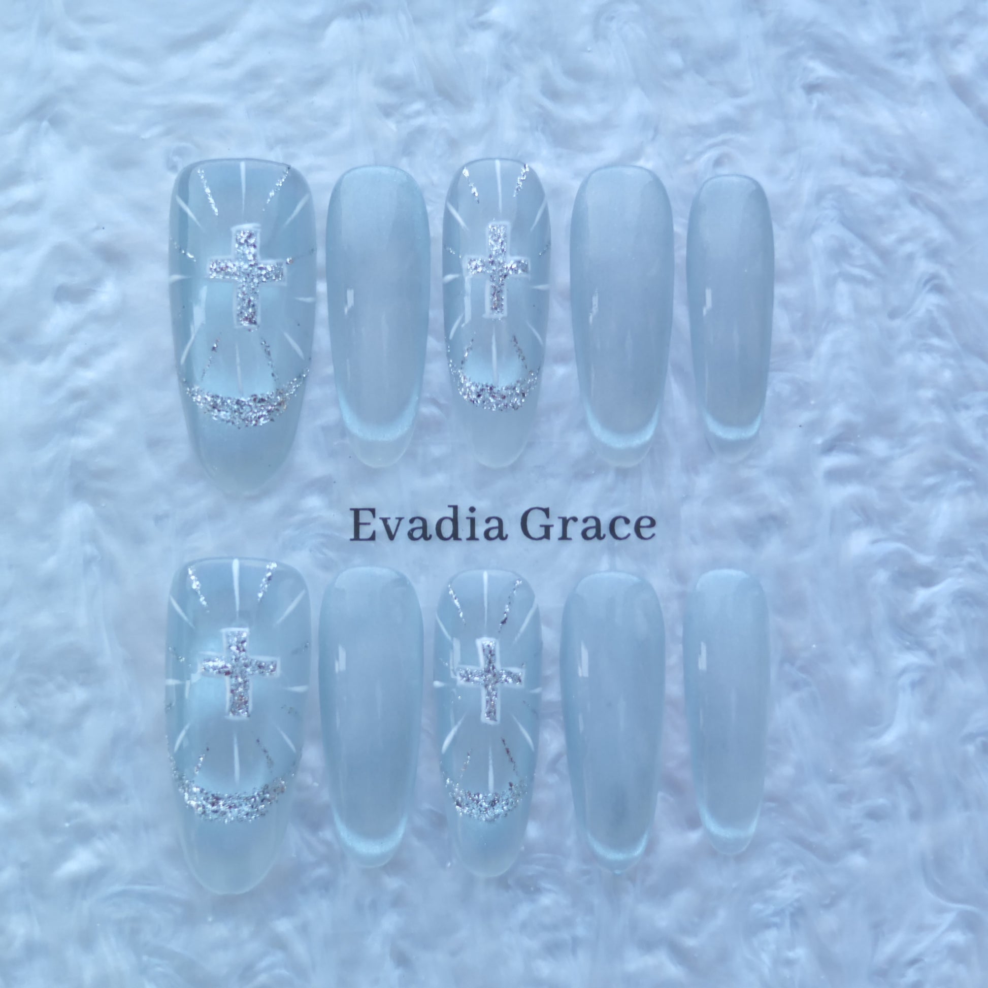 Ice Silver Cross Nails – Frosted White Glazed Press-On Nails with Glitter Halo & Holy Light Design | Evadia Grace