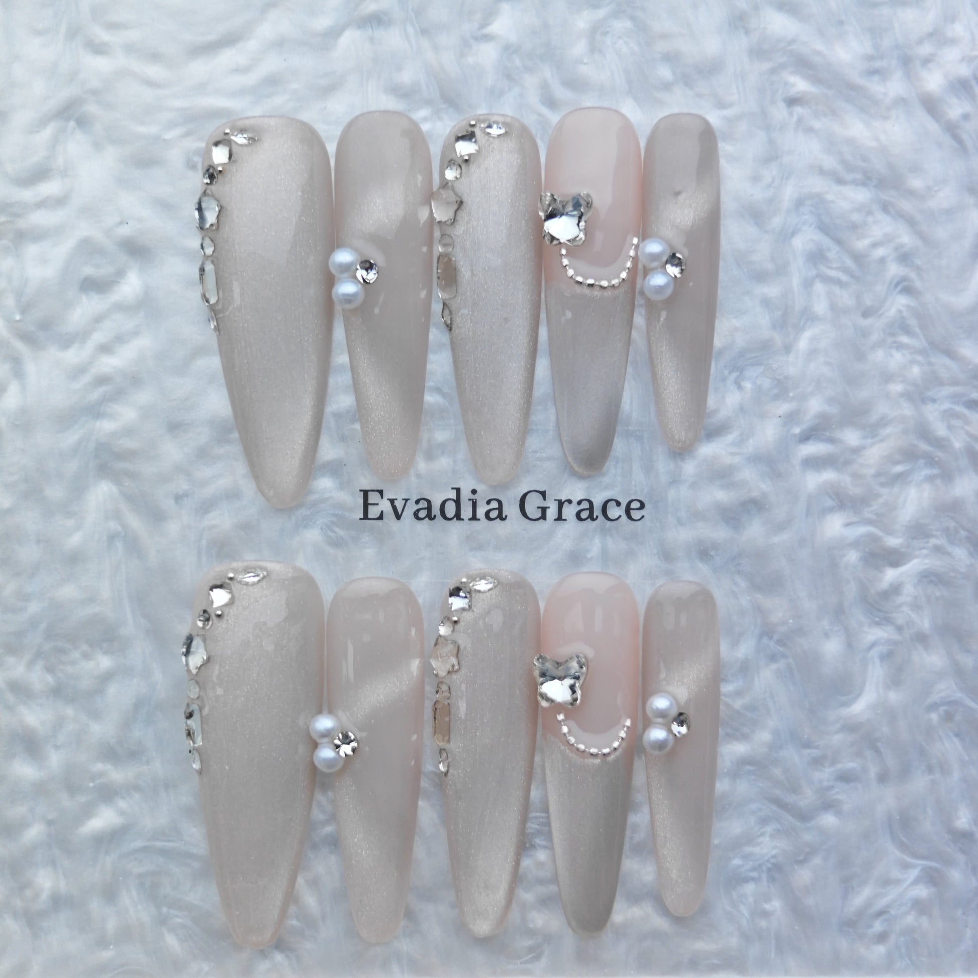 Nude Silver Pearl Butterfly Press On Nails – Elegant Long Stiletto Fake Nails | Bridal & Party Reusable Nail Art Tips